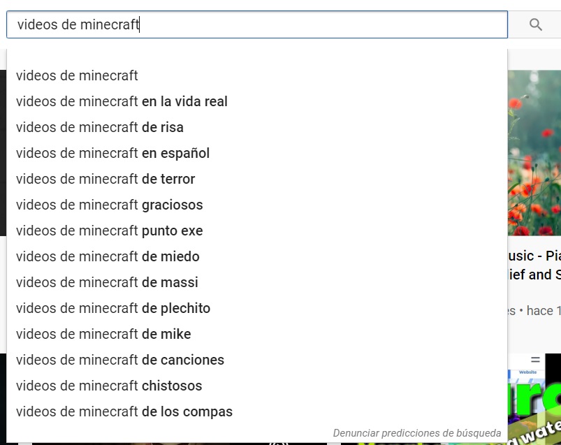 La forma más simple de generar una lista de palabras claves es la búsqueda en YouTube. Simplemente diríjase a YouTube, y comience a escribir la palabra clave del tema que desea abordar. La lista de búsqueda sugerida puede darle una idea general de lo que la gente está buscando en YouTube.