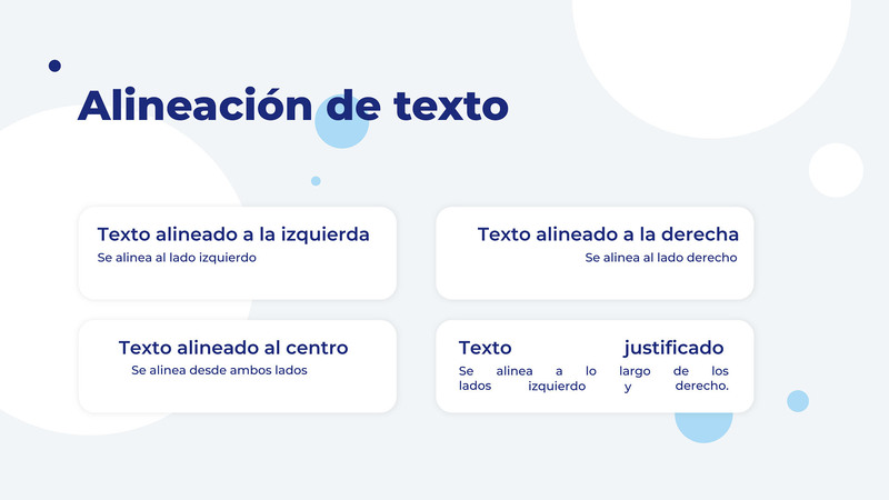 Cuando elija cualquiera de las opciones de alineación, asegúrese de que no queden palabras sueltas («viudas») o signos de puntuación en una sola línea. Para que el texto sea más atractivo visualmente, mantenga el texto ordenado y limpio, y no olvide usar el espaciado en caso de ser necesario.