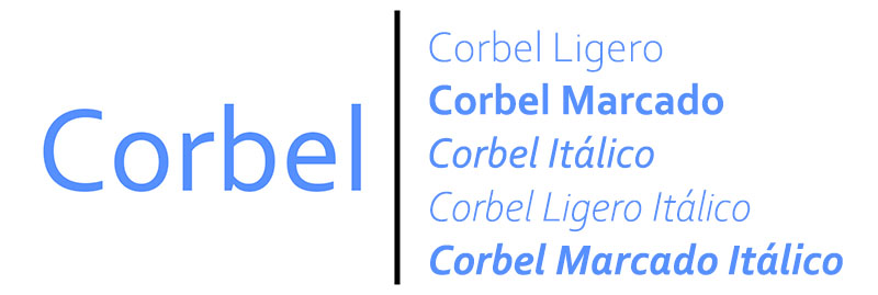 Por ejemplo, Corbel es un tipo de letra compuesto por Corbel Light (Corbel Ligero), Corbel Bold Italic (Corbel Marcado Itálico), Corbel Light Italic (Corbel Ligero Itálico), etc.
