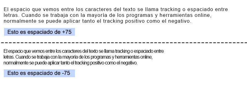 El espacio que vemos entre los caracteres del texto se llama tracking o espaciado entre letras. Cuando se trabaja con la mayoría de los programas y herramientas online, normalmente se puede aplicar tanto el tracking positivo (crear más espacio entre los caracteres) como el negativo (hacer que las palabras aparezcan juntas). Asegúrese de no aplicar más tracking del necesario, para que su composición tenga un aspecto artístico y a la vez profesional.