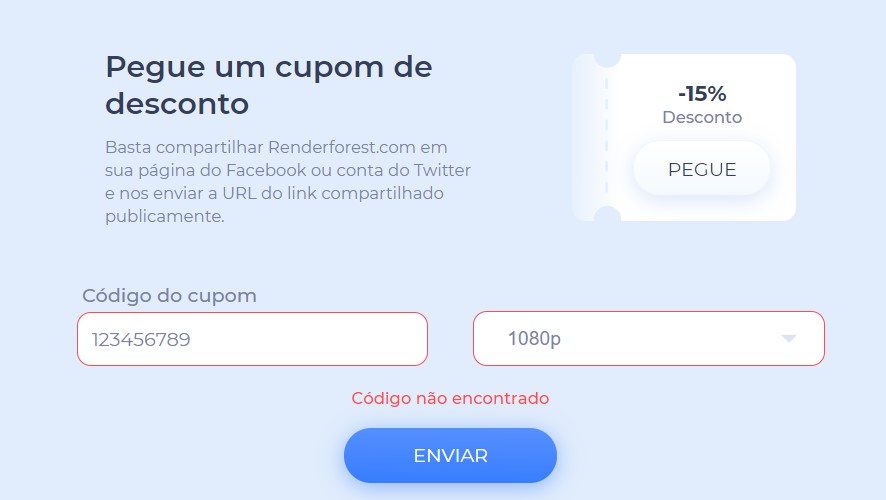 A única maneira de resgatar um cupom com sucesso é recebê-lo diretamente da Renderforest. Todos os códigos de cupom Renderforest fornecidos por terceiros são inválidos.