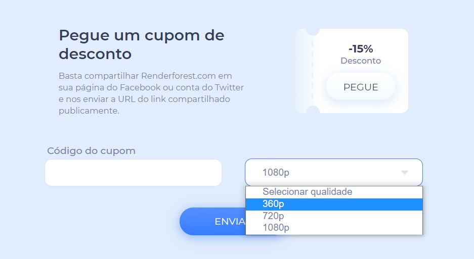 A maneira mais fácil de obter um cupom único de 15% de desconto é compartilhar a Renderforest em seu mural do Facebook ou feed do Twitter em modo público. Você pode compartilhar qualquer link que desejar do nosso site e adicionar sua opinião sobre nós. Basta enviar o link de sua postagem para nossa equipe de suporte, que você receberá o código do cupom e poderá exportar seu vídeo de alta qualidade com 15% de desconto.